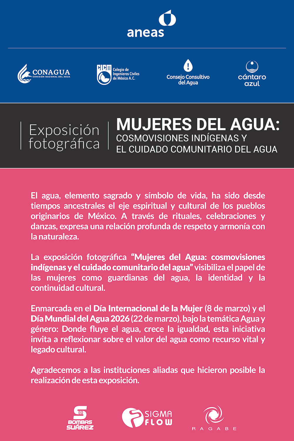 Esta exposición, conformada por 29 imágenes de 13 autores, expone la relevancia de las mujeres de pueblos originarios en la protección, gestión y transmisión de los saberes ancestrales vinculados al agua. En el marco del Día Internacional de la Mujer y el Día Mundial del Agua, la muestra invita a reflexionar sobre la relación entre agua, género y justicia social.